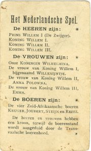 typisch Transvaalse boerenhoeden. De firma Senefelder, vernoemd naar de uitvinder van de lithografie, was tot en met 1908 gevestigd op de Looiergracht 47. Daarna op de Admiraal de Ruijterweg 56. De ontwerper van het spel, Johan George van Caspel (1870 - 1928) was oorspronkelijk schilder en later een van de eerste ontwerpers van affiches voor bedrijven. In 1896 kreeg hij een vaste aanstelling bij Senefelder (voorheen Steendrukkerij Amand). |