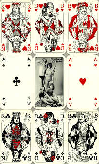 | EXTRA INFO | Het ontwerp van de hofkaarten is ontleend aan het Berlijnse of Noord-Duitse beeld. De kaarten zijn nagetekend. Als jaarlijks nieuwjaars-presentje kozen Auk en Trudy Boom dit jaar voor een spel kaarten. Zelf gingen zij op vakantie naar La Palma. Op de achterkant staan zij afgebeeld met hun dochters Marleen en Karina. De oplage bestond uit 150 spellen. | ||